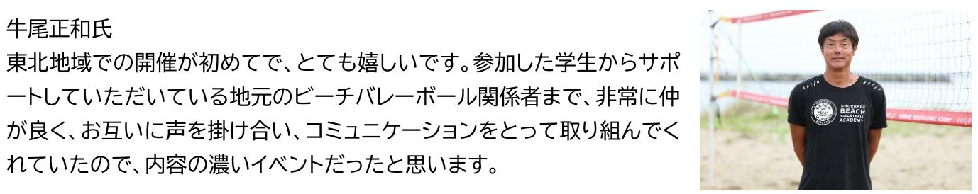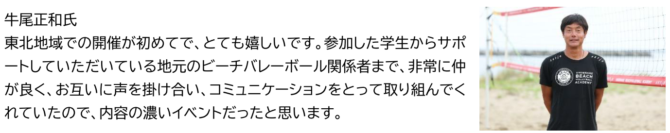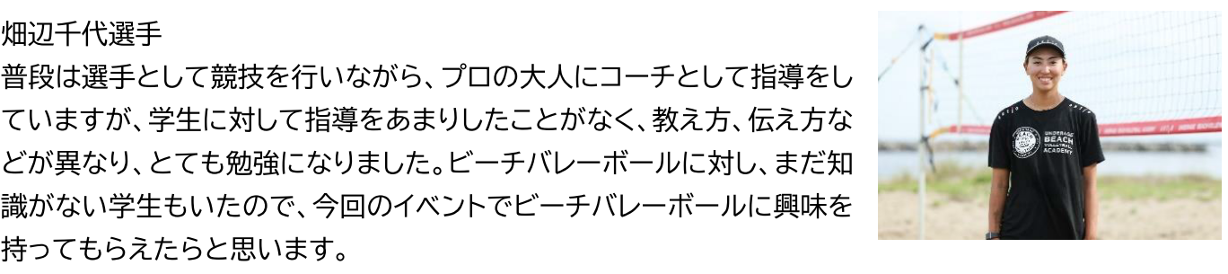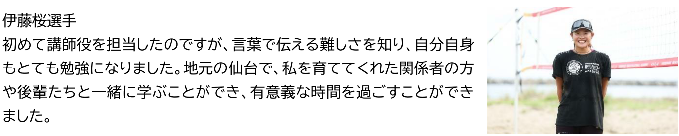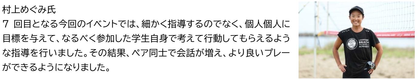 プロの選手から直接、テクニックや考え方などを教えてもらって、とても有意義な時間でした。インドアバレーボールと違い、コート上には2人しかいないため、ペアの味方に対して、先を読んでボールを繋げないといけないなど、実践的でとても勉強になりました。