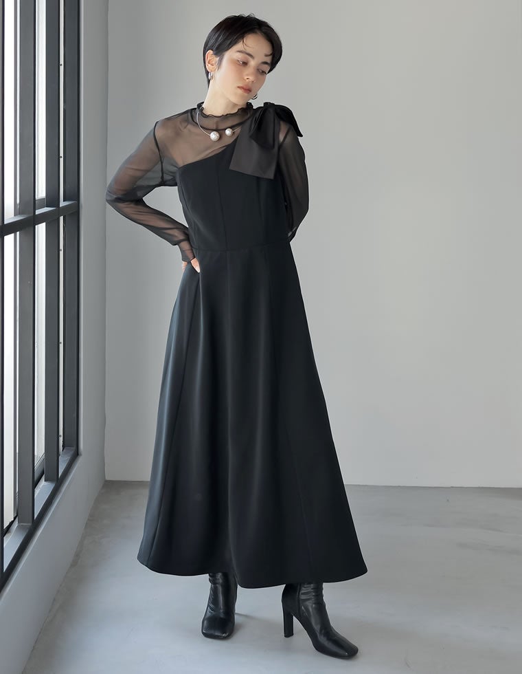 リボンワンショルフレアワンピース