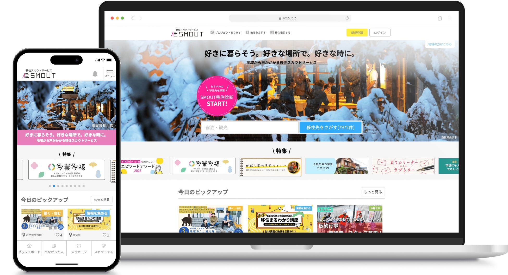 SMOUT(スマウト)は移住に興味のある人や地域とつながりたい人と、地域の人とをマッチングするWebサービスです。