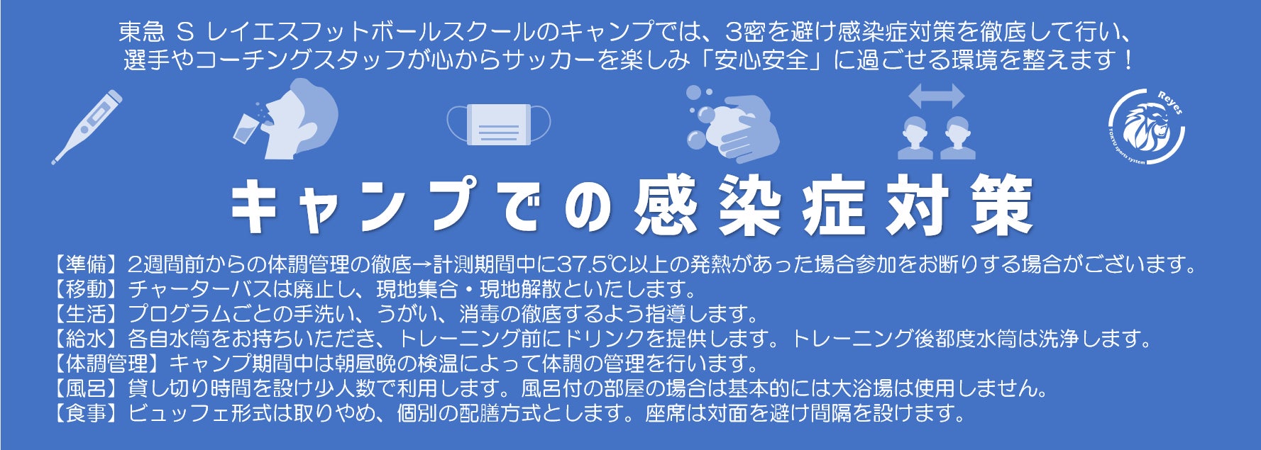 新型コロナウィルスの蔓延が予断を許さない状況が日々続いておりますが、東急Sレイエス フットボールスクールでは「選手たちに成長の機会をできる限り提供すること」と念頭に置き、下記の3点の条件を設けスプリングキャンプの開催をする運びとなりました。