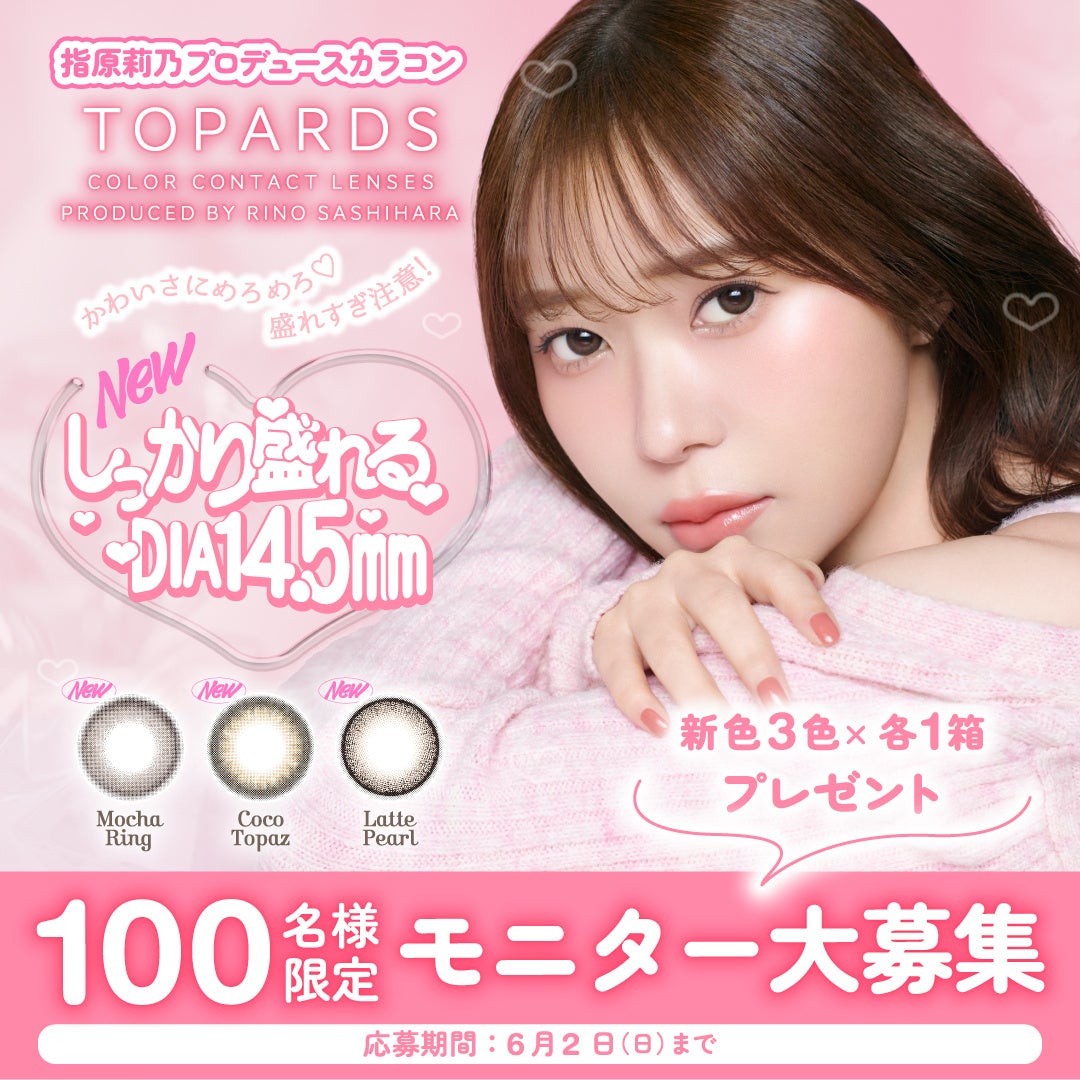 『TOPARDS(トパーズ)』は、透明感と潤いのある瞳にこだわって開発されたカラーコンタクトレンズブランドです。開発途中の商品を着用し、指原さん自ら“ちゅるん感、ウルウル感、透明感”とSNSで発言するなど潤いと透明感に徹底的にこだわりました。うるうる・キラキラした瞳に映り、どんなシーンにも馴染んでくれる商品となっております。