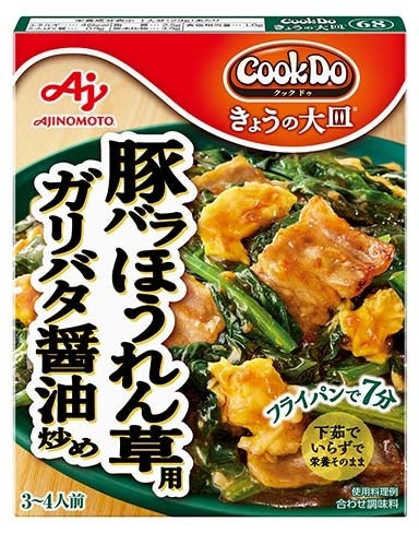 <豚バラほうれん草用>は、香ばしい炒めにんにくに、バターのコクを加えた醤油ベースのソースが食材によくからむ、ご飯との相性抜群のメニューが手軽に作れる調味料です。カルシウム素材の配合などの当社独自技術(特許出願中)により、下茹でなしでもほうれん草のえぐみを和らげるので、手軽に、しかもほうれん草の豊富な栄養を損なうことなく調理できます。さらに独自素材による深みのあるバターの風味で、子どもから大人までおいしく食べられるメニューが完成します。