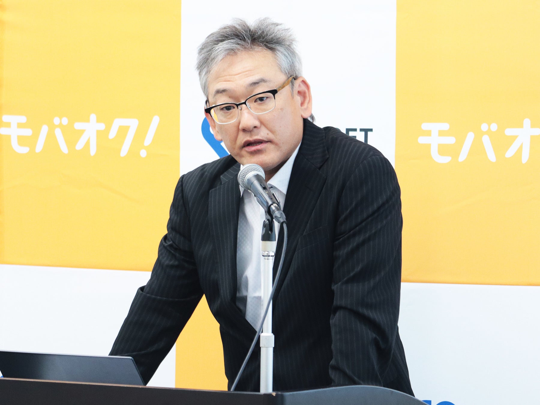 続いて、株式会社モバオク 取締役COOの小田切航平が登壇し、モバオクの事業戦略とサービスアップデートについて説明を行いました。