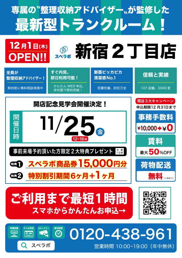 【12月1日(木)オープン】見学から契約、解約まで完全非接触・非対面、お申し込みからご利用まで最短1時間!都内、大阪などにて絶賛運営中のトランクルーム【スペラボ】が新宿2丁目に出店!