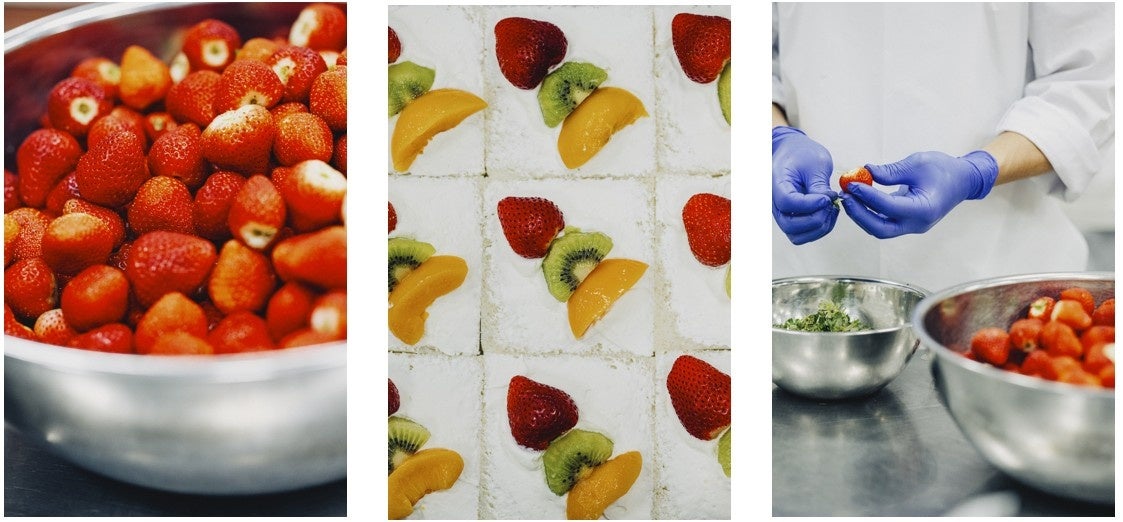 定番商品として年中揃えられるフルーツを挟みました。黄桃は、コクと甘みが強いのでいちごよりも酸味の強いキウイフルーツを一緒に挟むことでバランスの良い組み合わせに仕上げました。