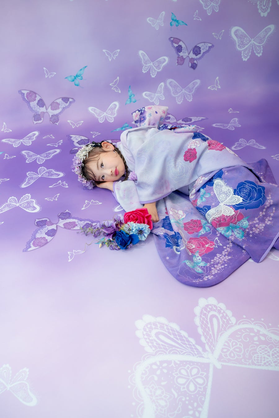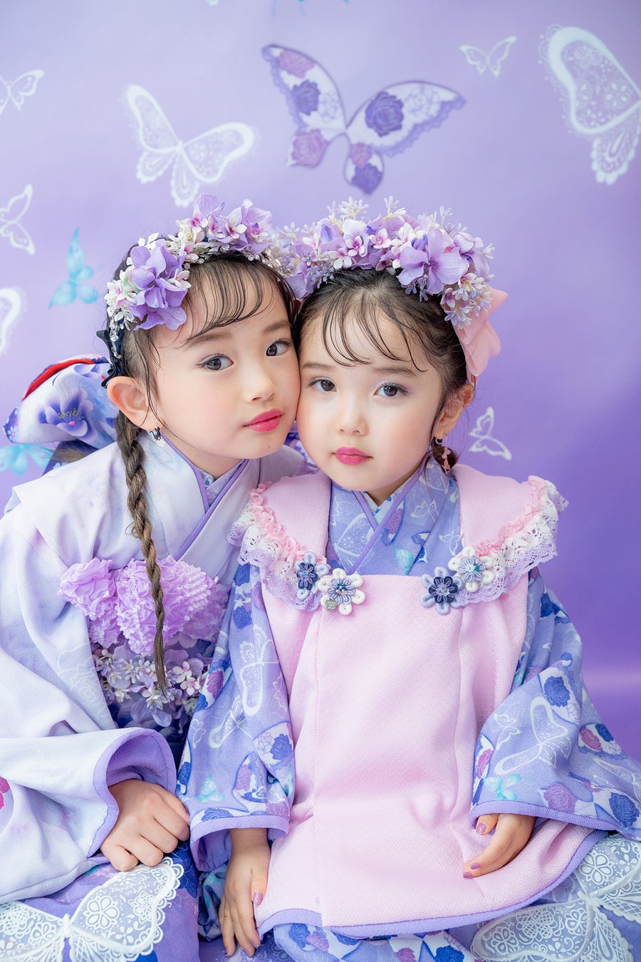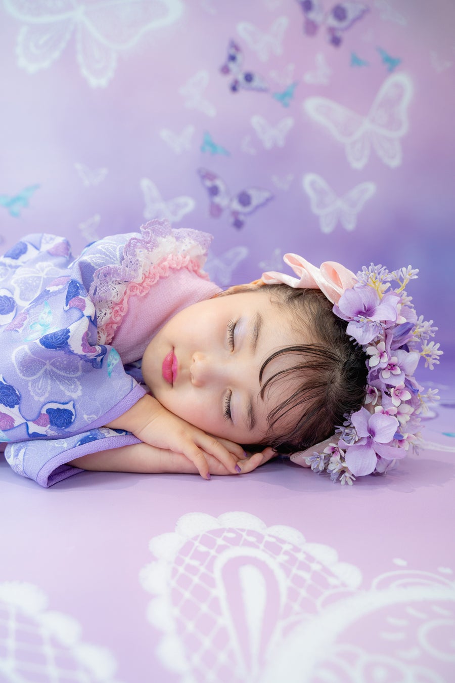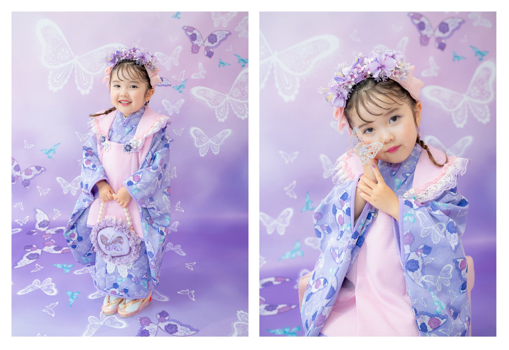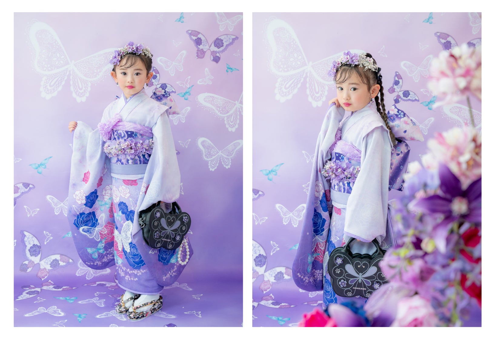 3歳の装いは、ラベンダーカラーで優しい雰囲気に。