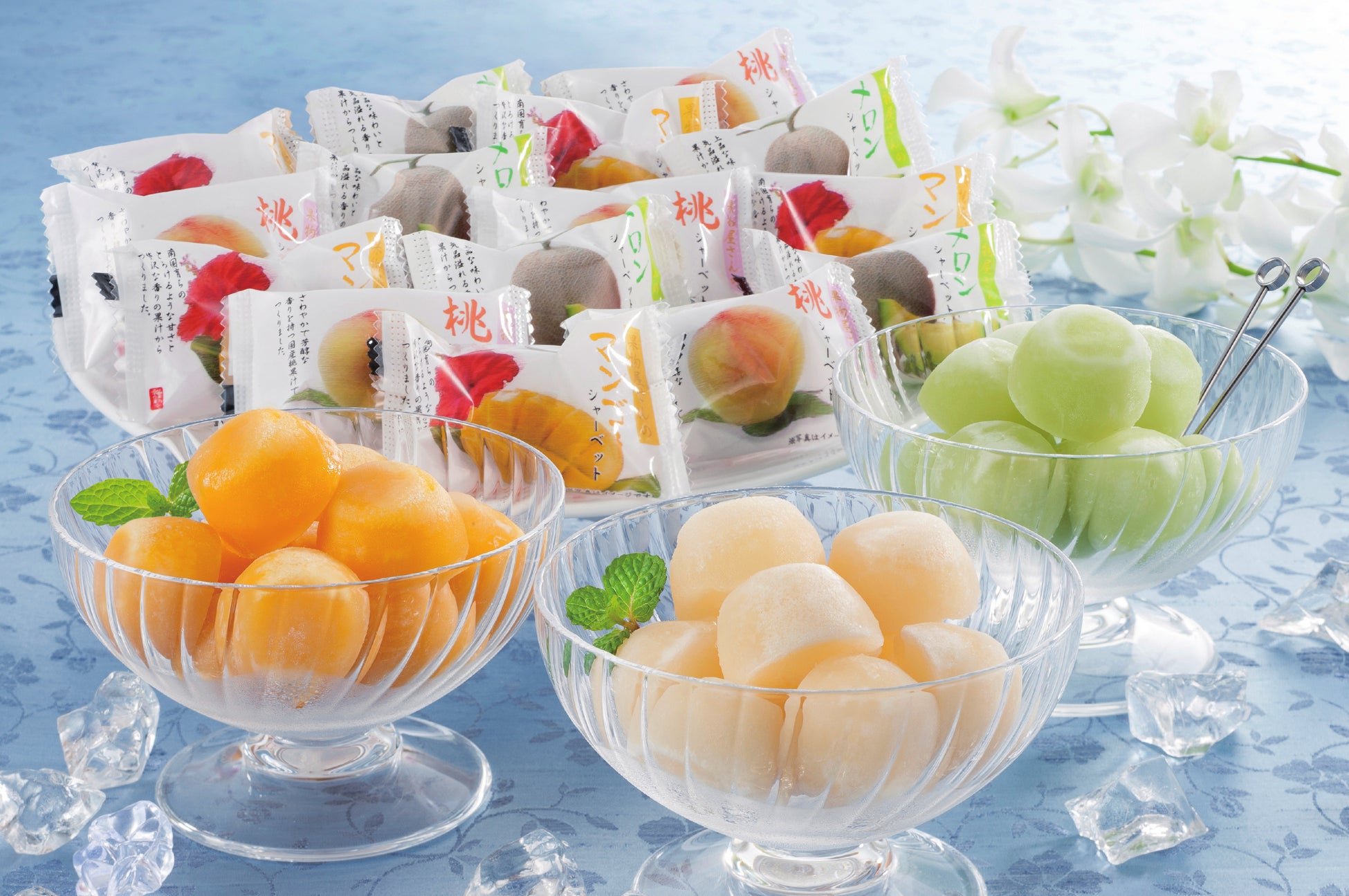 メロン・桃・マンゴーのおいしさを詰め込んだ風味いっぱいのアイスギフト。ひとくちサイズで食べやすく、暑い夏の贈り物にぴったり。