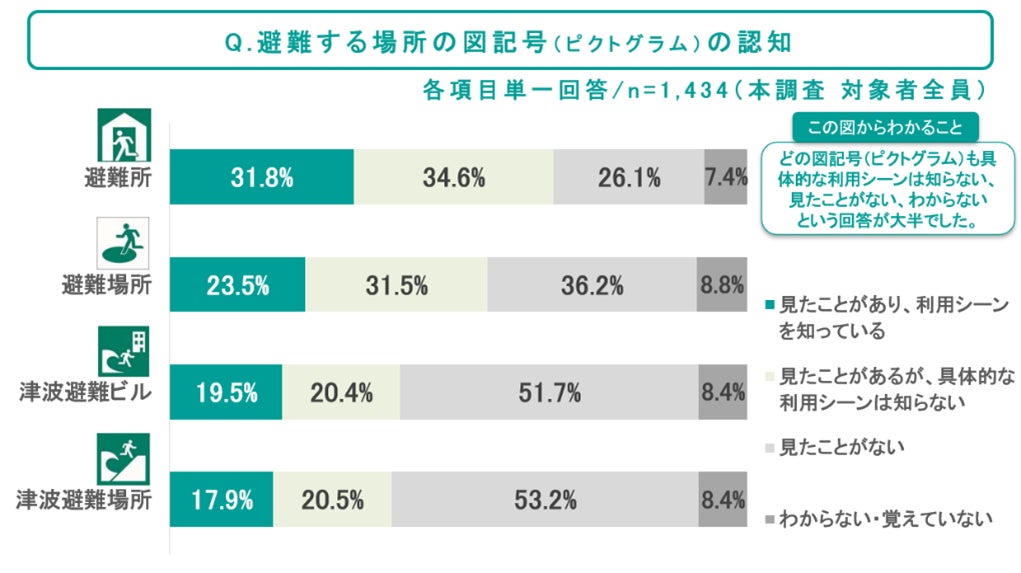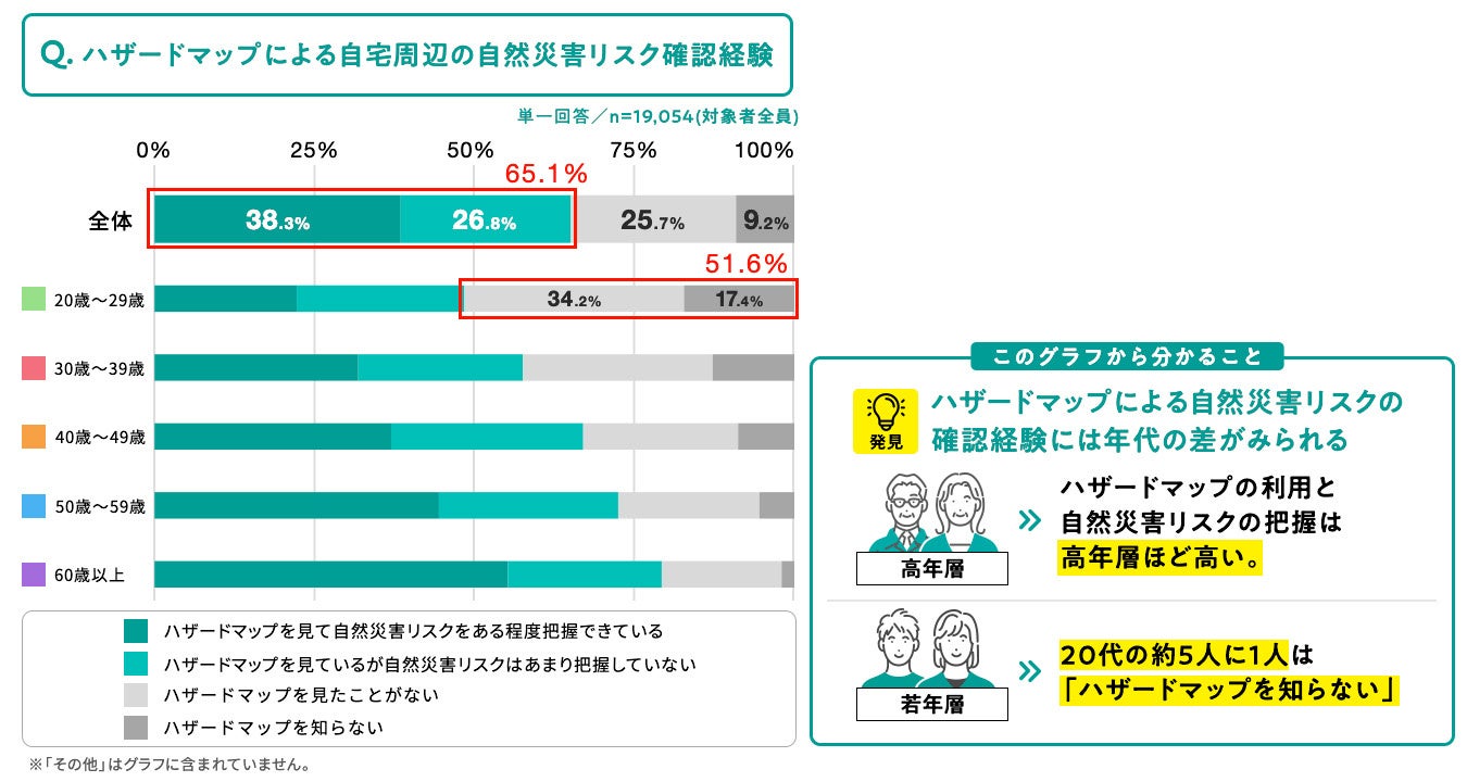 ハザードマップを見たことがある人※3は、65.1%。ハザードマップを見て自宅周辺の自然災害リスクをある程度把握できている人は、38.3%という結果に。年代が上がるにつれて割合が高くなる傾向にあるという結果がでました。一方で、20代は、ハザードマップを見たことがない人・知らない人の合計が51.6%存在し、約5人に1人(17.4%)は、「ハザードマップを知らない」という回答となり、認知度が低いことがわかりました。