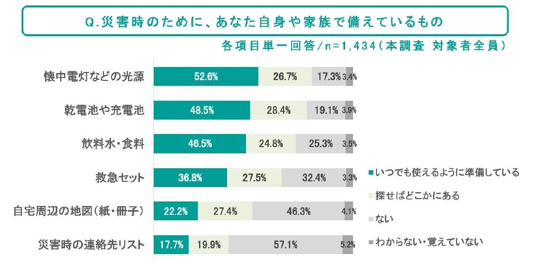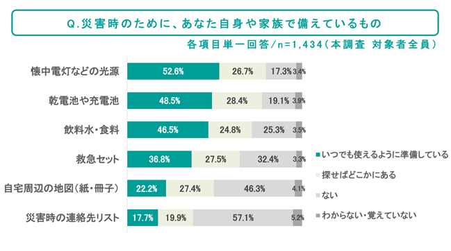 備蓄品に関しては、懐中電灯などの光源、飲料水・食料などをいつでも使えるように準備している人は、約半数近く存在しますが、自宅周辺の地図をいつでも使用できるように準備している人は、22.2%という結果に。いざという時に困らないように、地図を含めた準備を日頃からしておくことも重要です。