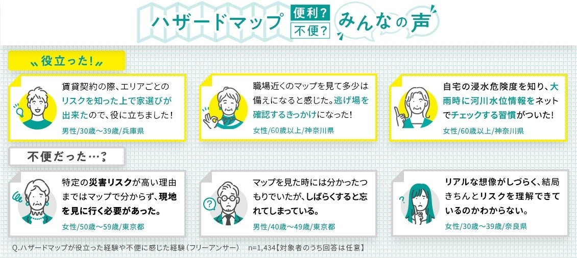 ハザードマップを見て平時の際も役に立っているという声もある一方で、ハザードマップから災害の危険度を読み取る難しさなど、ハザードマップの理解にも課題があることがわかりました。