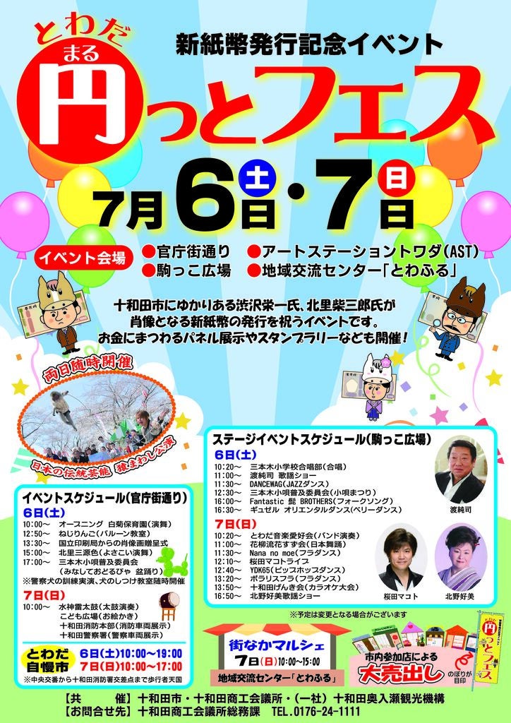 渋沢栄一氏、北里柴三郎氏を肖像に採用した新紙幣が発行されることを記念するイベントです。期間中に、「街なかアートマルシェ」、「とわだ自慢市」など、地元物産・グルメのマーケットを実施し、伝統芸能・ダンス・音楽などジャンルを超えたステージイベントを上演いたします。ほかには、お金にまつわるパネル展示やスタンプラリー、地元参加店舗による大売出しなども開催いたします。