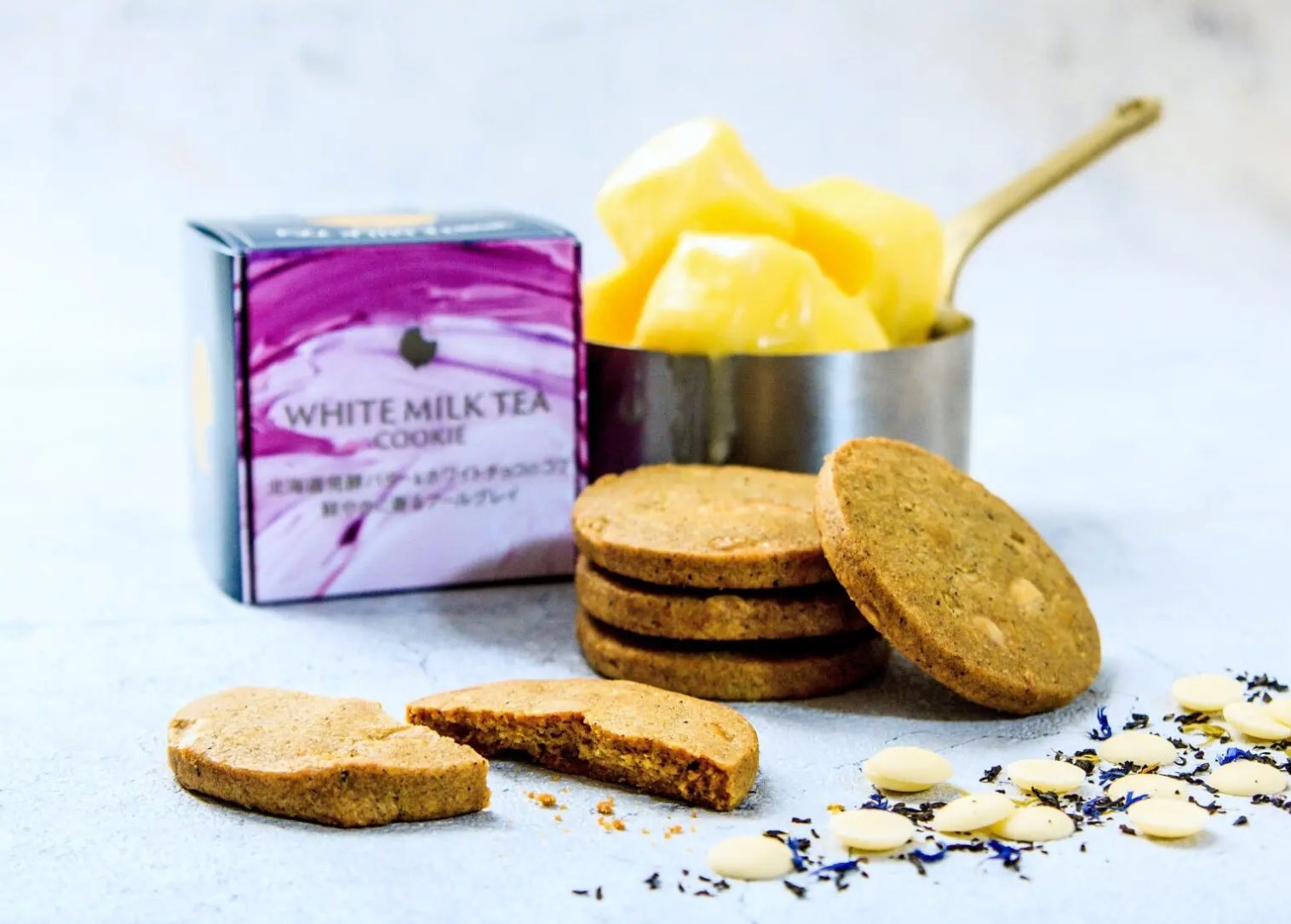ミルクティーホワイトチョコクッキーは、リッチなロイヤルミルクティをそのまま食べているようなクッキー。toroaオリジナルブレンドの紅茶toroaTeaのジンライム(アールグレイ)を挽いて混ぜ込んだ生地は大変香りがいいです。 北海道産発酵バター100%使用、北海道産練乳を混ぜ込んだ生地にホワイトチョコも配合することでミルクリッチな味わいに仕上げています。