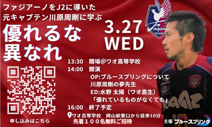 登壇するのは、ブルースプリングのメンバーの一人である水野君と、プロサッカークラブファジアーノ岡山の元キャプテン、川原周剛さんです。川原さんはファジアーノ岡山をJ2に導いた元キャプテンとして、「好きなことで生きていく」を授業のテーマに掲げ、水野君は「出会いと継続」のテーマのもと自身の経験から皆さんに伝えたいことを話します。先着100名様をご招待いたしますので、 この機会に「すべての人が青春できる社会」を目指す、高校生の活動をぜひご体験ください。