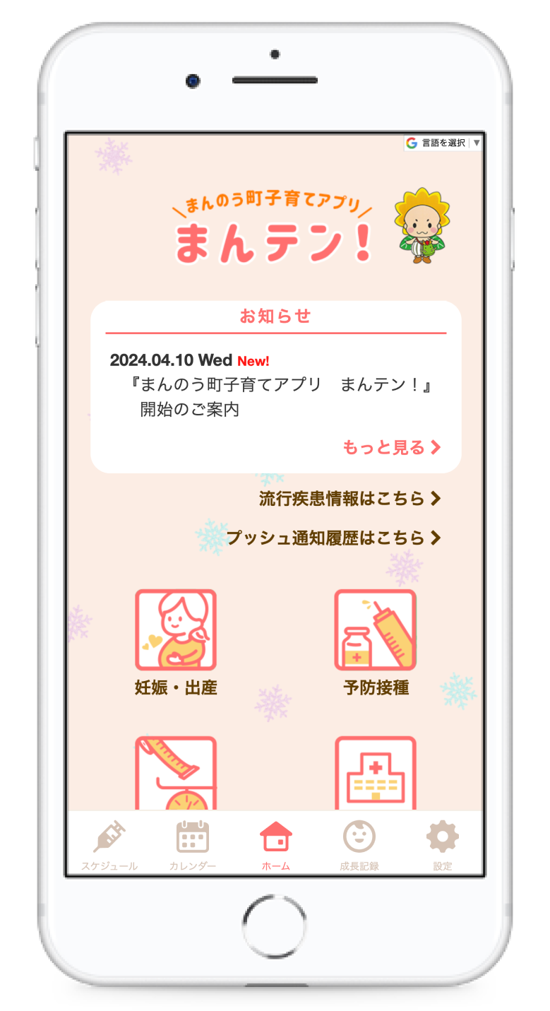まんのう町マスコットキャラクターの「まんテンちゃん」のように、子どもたちが健やかに” 元気まんまん”に育ってほしいという想いを込めて、「まんのう町子育てアプリ まんテン!」と命名しました。トップページには、「まんテンちゃん」が登場。まんのう町らしさが詰まったこだわりのデザインでお届けします。