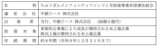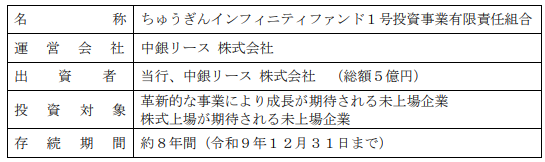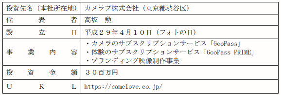 当行ならびに中銀リース(岡山市北区丸の内一丁目14番17号 取締役社長 西明寺 康典)は、スタートアップ企業を出資対象とする『ちゅうぎんインフィニティファンド』がカメラブ株式会社(東京都渋谷区、代表取締役 高坂 勲)の実施する第三者割当増資を引受けましたことを、お知らせいたします。
