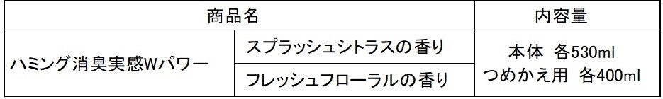 このたび新発売の「ハミング消臭実感Wパワー」は、消臭成分をW配合し、洗っても落ちないと感じる汗臭と脂臭をしっかり消臭します。さらに、ハミング消臭実感シリーズに新搭載の防臭技術として“さらさらコーティング成分”を配合。ニオイの元となる脂が衣類に付着することを抑制し、嫌なニオイの発生をブロックします。また、すっきりとした「スプラッシュシトラスの香り」と、華やかな「フレッシュフローラルの香り」の2つをラインアップしました。