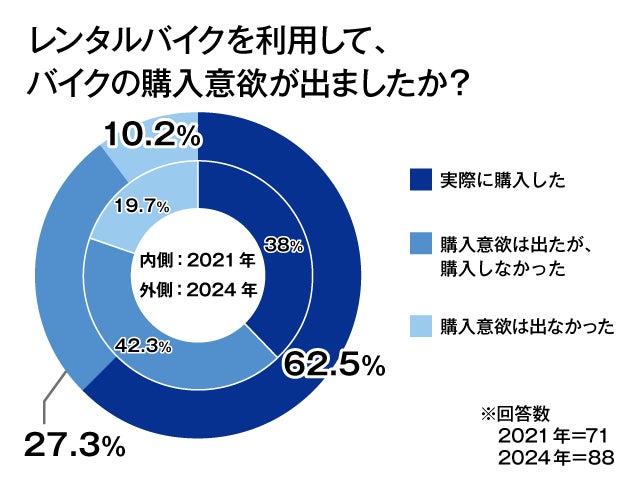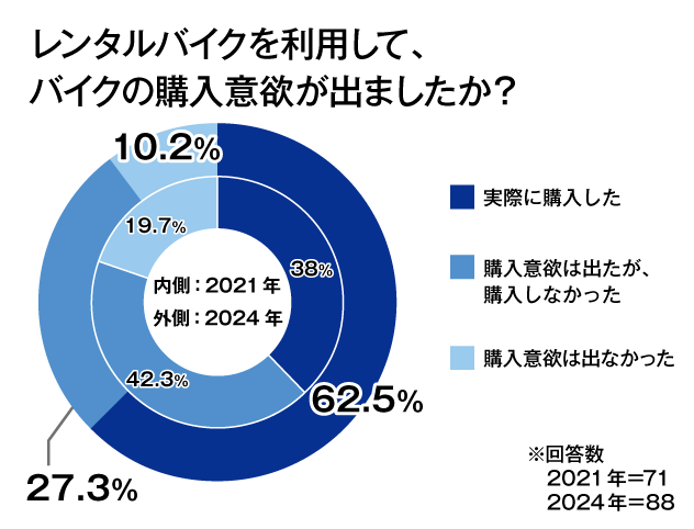・レンタルバイク利用者で「実際に購入した」と回答した方の割合は、2021年の調査と比較すると24.5ポイント