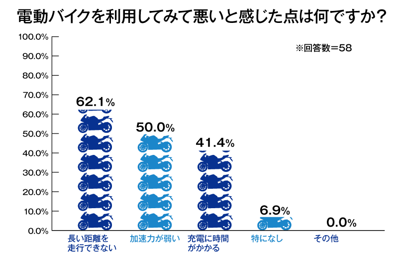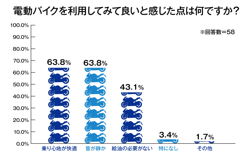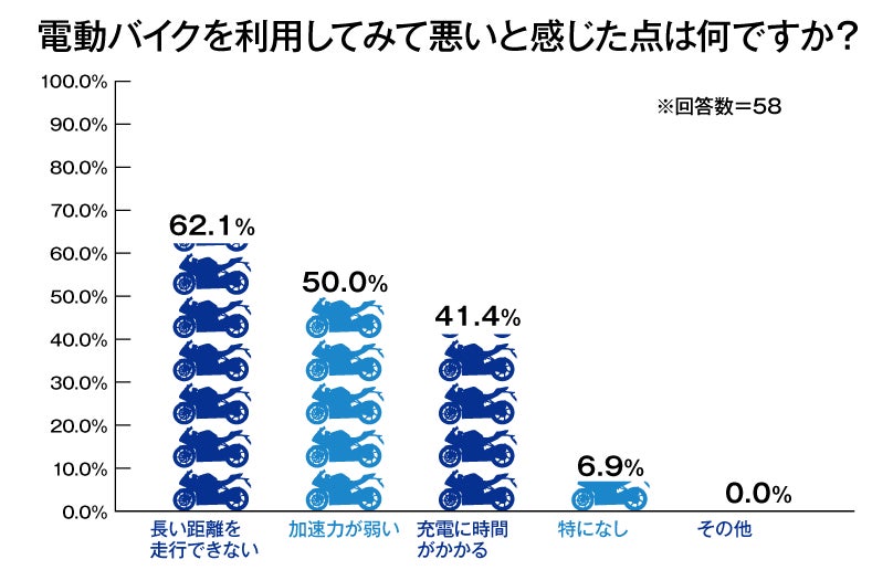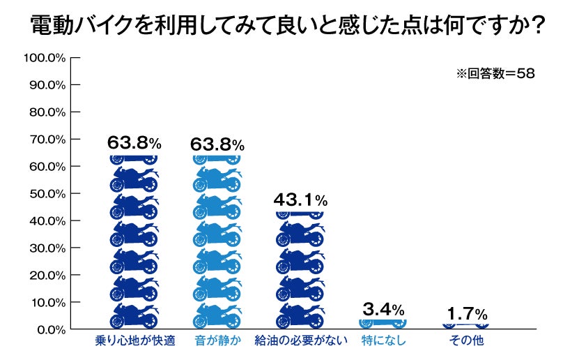 バイク利用者の37.2%は、「電動バイクを利用したことはある」と回答した。また電動バイクを利用して感じた良い点は、「乗り心地が快適」「音が静か」が上位にあり、悪いと感じた点の上位は、「長い距離を走行できない」「加速力が弱い」だった。良い点、悪い点を踏まえると、日々の生活シーンでの利用が適していると思われる。また、電動バイクを利用したことがある91.4%は「電動バイクを購入したいと思う」と回答しており、電動バイクの利用で感じられた快適さが電動バイクの購入意欲にも寄与していると思われる。
