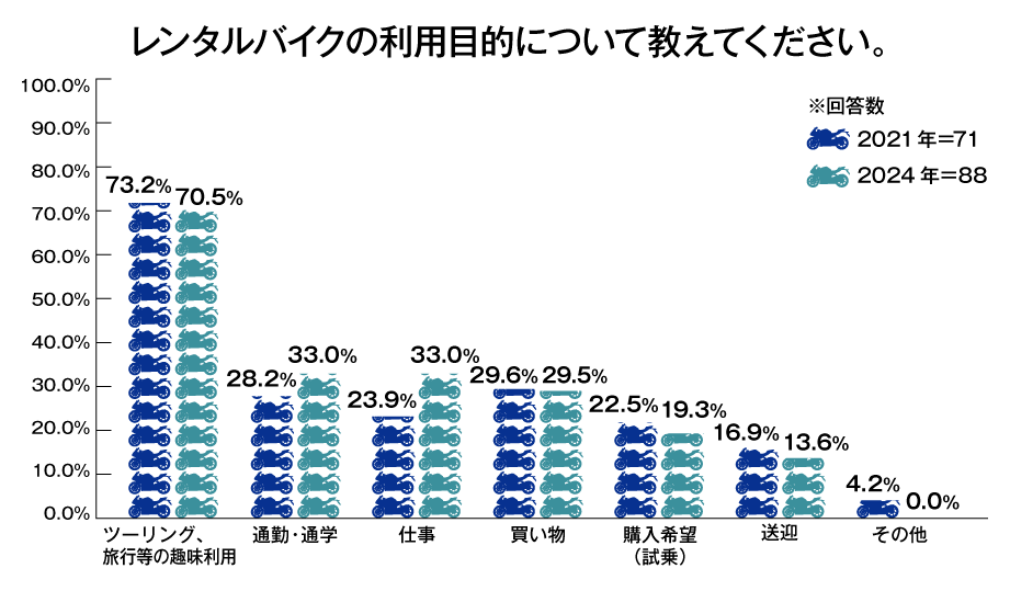 レンタルバイクの利用目的では、「ツーリング、旅行等の趣味利用」が多く、「購入希望(試乗)」は少ない。その傾向は前回調査と大きく変化が見られなかったため、レンタルを通じたバイクの楽しさや利便性などの体験が、バイク購入に大きく寄与していることがうかがえる。また、「仕事」と回答した方が前回調査から9.1ポイントアップしており、ビジネスでの活用が増加していることもわかった。