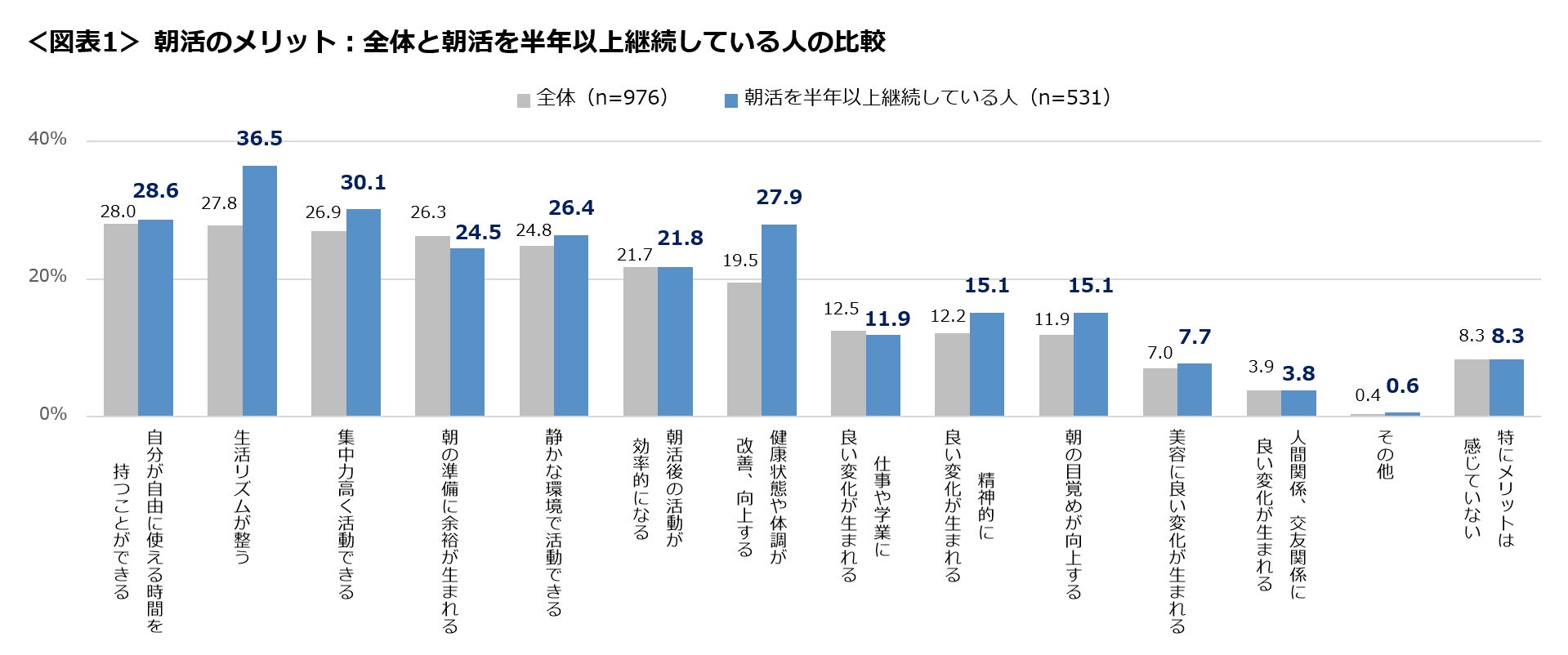 朝活のメリットについて聴取したところ、全体では「自分が自由に使える時間を持つことができる(28.0%)」が最も高い結果となりました。朝活を半年以上継続している人は、全体の数値と比較すると「生活リズムが整う」が+8.7ポイント、「健康状態や体調が改善、向上する」が+8.4ポイントとなりました。