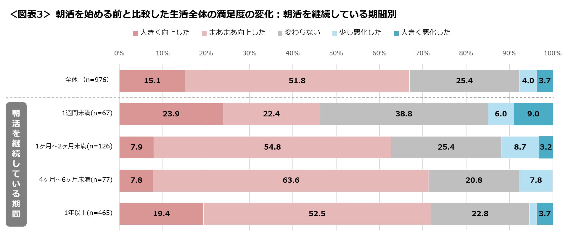 朝活を始める前と比較した生活全体の満足度の変化について聴取したところ、「大きく向上した」の割合は全体で15.1%、さらに朝活を始めて1週間未満の時点では23.9%となりました。朝活を始めて1ヶ月~6ヶ月未満では「大きく向上した」の割合は一度減少するものの、継続期間が長くなるにつれて増加。朝活を継続することで生活全体への良い影響を実感する人が増えることがうかがえます。