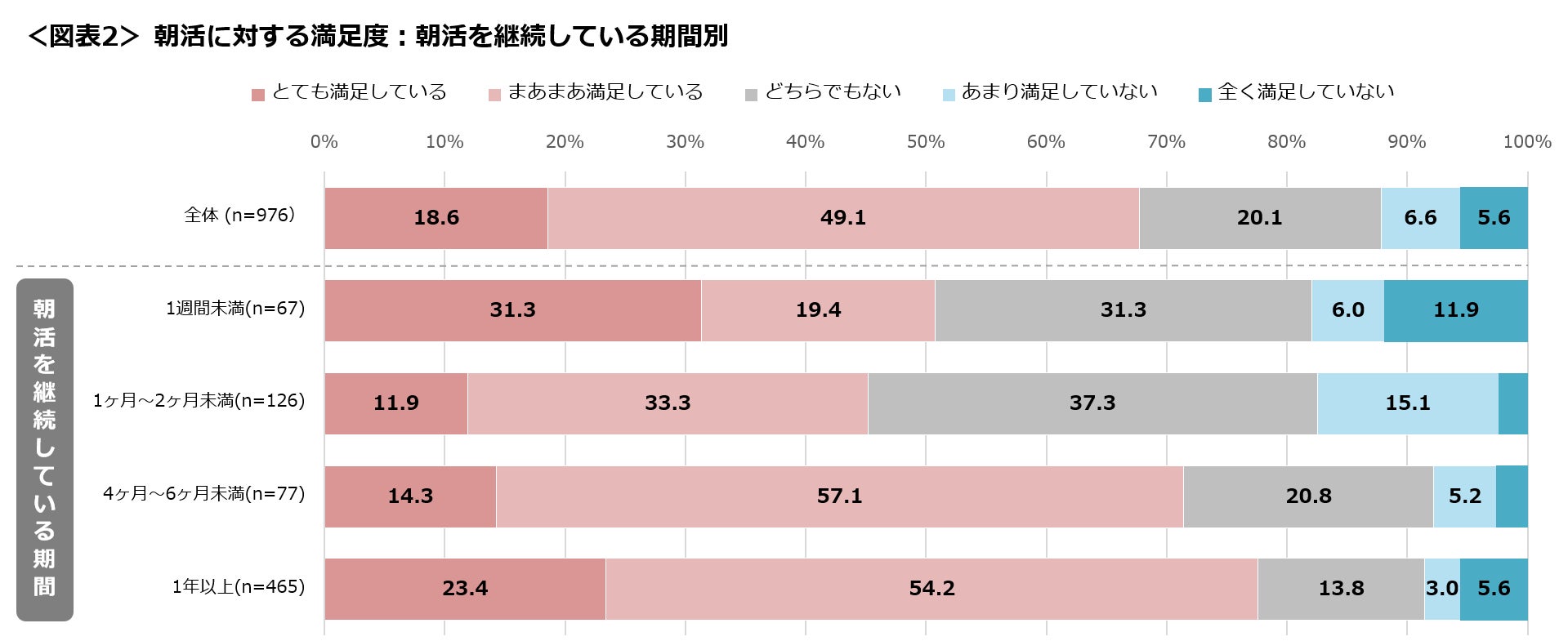 朝活に対する満足度を聴取したところ、「とても満足している」の割合は全体で18.6%、さらに朝活を始めて1週間未満の時点では31.3%となりました。朝活を始めて1ヶ月~2ヶ月未満では「とても満足している(11.9%)」と「まあまあ満足している(33.3%)」の割合が一度減少するものの、4ヶ月目以降で再び増加。朝活を生活に取り入れていく過程で、一度満足度が落ち着き、その後習慣化することで再び満足感が高まることを示しています。