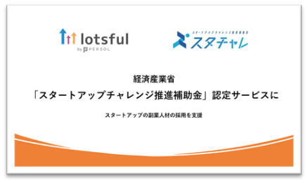総合人材サービス、パーソルグループのパーソルイノベーション株式会社(本社:東京都港区、代表取締役社長:長井 利仁)が運営する副業人材マッチングサービス『lotsful(ロッツフル)』(https://lotsful.jp/)は、経済産業省が実施するスタートアップチャレンジ推進補助金の認定サービスに選ばれたことをお知らせいたします。今回の認定を受け、副業人材の採用に『lotsful』を活用すると、補助金を受け取ることが可能になります。※1※2 『lotsful』は登録事業者として、スタートアップにおける人材不足の課題解決に貢献します。