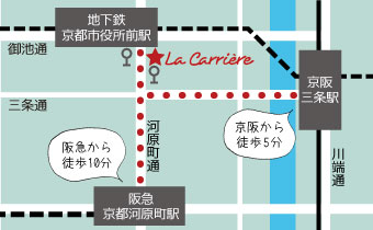 アクセス:京都市営地下鉄東西線「京都市役所前」駅および京都市営バス「河原町三条」停留所および京都バス「河原町御池」停留所すぐ、京阪本線「三条」駅から徒歩5分、阪急京都本線「京都河原町」駅から徒歩10分