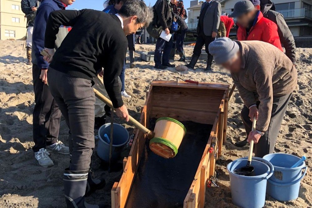 今回のイベントでは、弓ヶ浜および稲村ヶ崎海岸で採取した砂鉄を用いて、「たたら製鉄」による製鉄を行い、弓ヶ浜の砂鉄から抽出したケラについては、後日、米子市へ返還します。なお、飯岡海岸で採取した砂鉄についても後日製鉄を行う予定です。