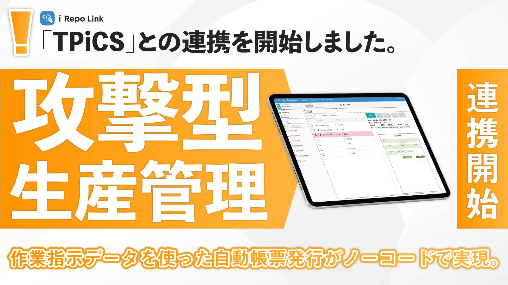 本連携には、都度、コーディング等の開発コストが発生する課題がございましたが、今回新たにリリースした「i-Repo Link for TPiCS」を用いることで、連携開発も専用インターフェースを用いたノーコードで実装が可能になります。”正確”により”早く”現場情報を生産管理システムに連携可能することにより、速く、安く、需要変動にレスポンス良く、安定した攻撃型生産管理を実現します。