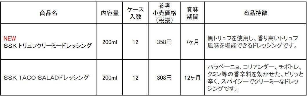 エスエスケイフーズ株式会社(本社:静岡市葵区)は、おうちで世界の味が楽しめる商品として新たに「SSK トリュフクリーミードレッシング」を発売致します。また、日頃ご愛顧いただいている「SSK TACO SALADドレッシング」の特徴がより伝わるようパッケージリニューアル致します。