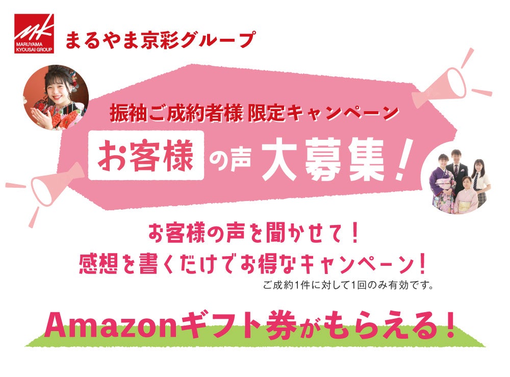 呉服専門のグループ企業「まるやま・京彩グループ」におきまして、2024年7月から、全国38か所の振袖取り扱い店舗で《振袖のご成約をされた方限定》の「お客様の声大募集」キャンペーンをスタートしました。