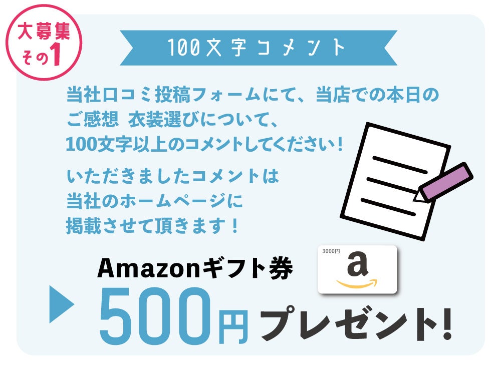 振袖ご成約後に口コミ投稿すると、500円分のAmazonギフト券をプレゼント。投稿した口コミにつきましては、当社ホームページに掲載させて頂きます。