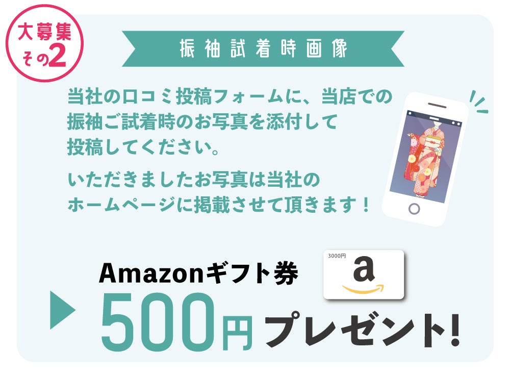 振袖ご成約後に振袖試着時画像を投稿すると、500円分のAmazonギフト券をプレゼント。投稿した写真につきましては、当社ホームページに掲載させて頂きます。