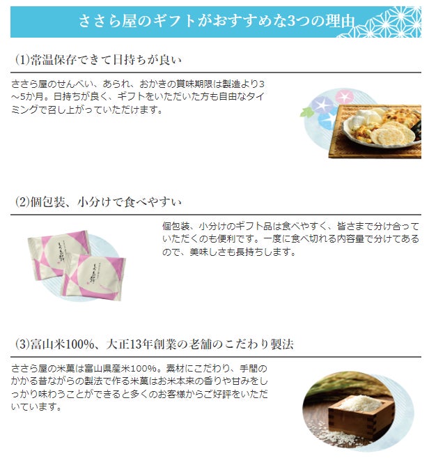 毎年ご好評いただいていますささら屋人気の8種類の米菓商品の詰合せ商品「みずほの彩<月>」、プレミアムしろえびせんべいとしてビジネスのお取引先様にも喜ばれる「90枚しろえび撰<風呂敷>」などのギフト商品については期間限定・送料無料(当社負担)でお届けする「送料サービスプラン」対象となります。他にも夏ギフト商品を多数ご用意しています。