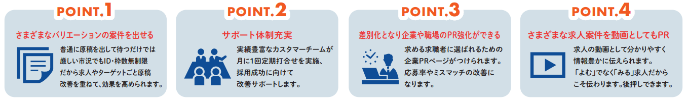 求人の動画として分かりやすく情報豊かに伝えられます。「よむ」でなく「みる」求人だからこそ伝わります。