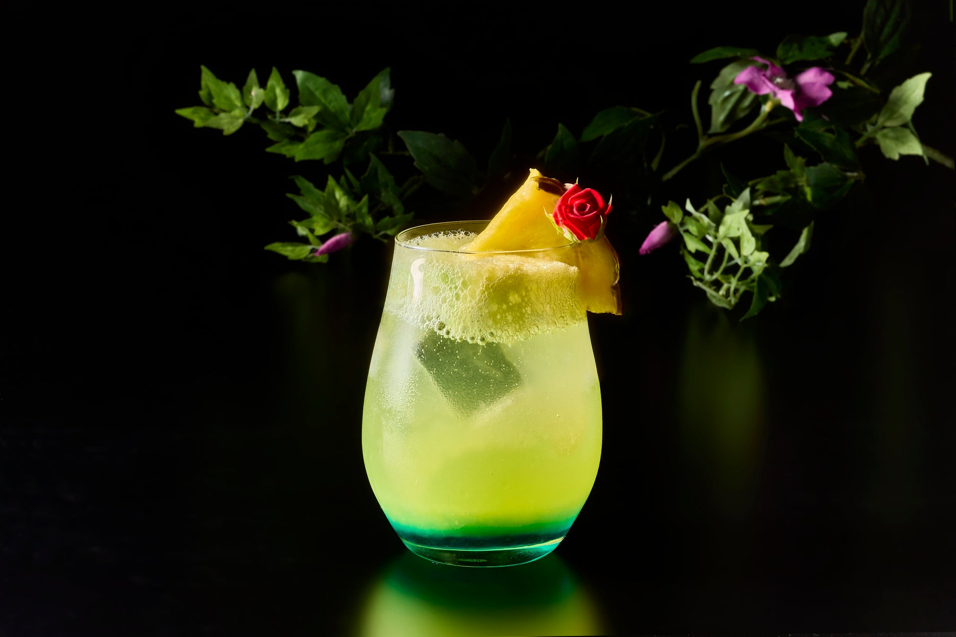 パイナップルとグレープフルーツのジュースにブルーキュラソーのシロップ、ローズジャムを加えて華やかさを演出しました。