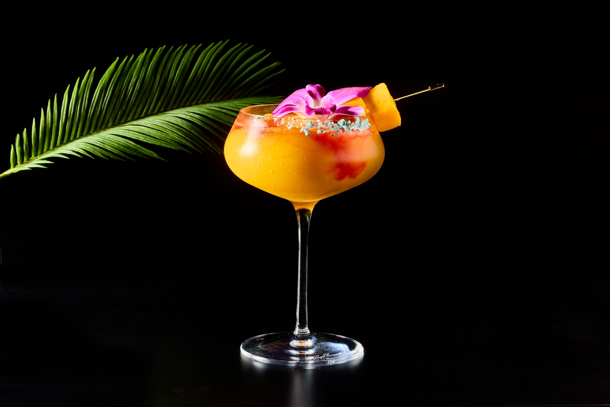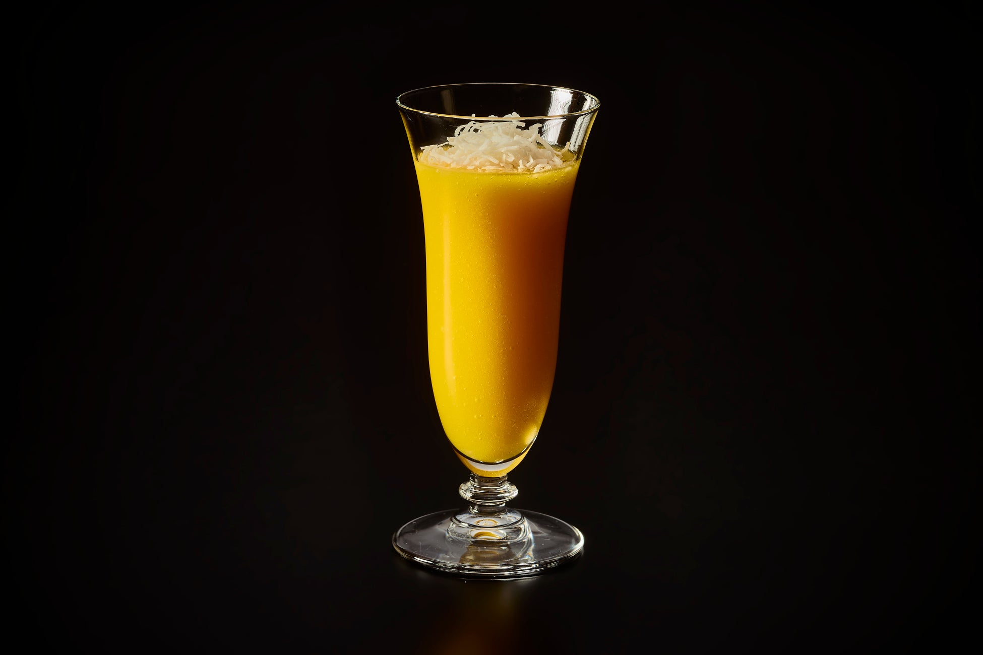 マンゴーとココナッツリキュール、ハイビスカスシロップで彩りのアクセントを加えたトロピカルなフローズンカクテル。