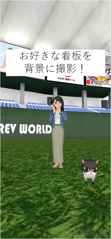 REV WORLDS内に展開されるバーチャルの東京ドームです。いつでも・どこでも・だれとでも、お手持ちのスマートフォンから遊びに行くことができ、東京ドームのグラウンド内を走り回る、マウンドで寝転んで友人と談笑、地下にある秘密の場所に行くなど・・・。