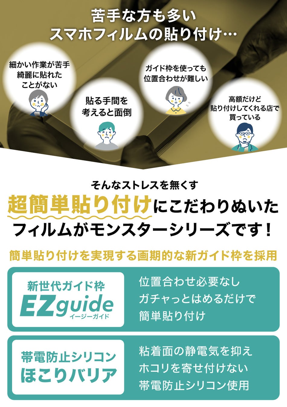 モンスターフィルムは、お客様より貼りやすいと評判の「EZguide(イージーガイド)」がセットになったガラスフィルムです。強化ガラス自体もハイスペックなガラスを使用しております。