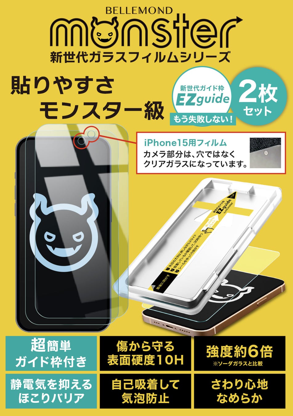 簡単に位置合わせができるEZguideで人気のモンスターフィルム!アイフォン15 / プラス / プロ / プロマックス 用も発売開始!貼るだけでブルーライト約50%カットの画面保護フィルムです!