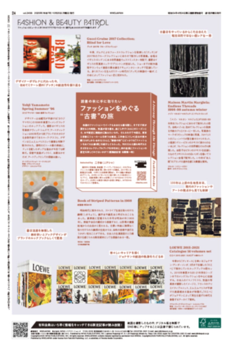 連載では、高口康太さんの中国電脳コマースに注目です。紹介するのは、新しい口コミ・レビューサービス。中国でも恣意的なレビューや、ボットによる口コミの大量生産などが問題になるなか、あのアリババグループは、こうしたフェイクを見抜くAIをフル活用し、さらには消費者の企業やブランド、サービスへのロイヤリティさえ勘案した精度バツグンの口コミ・レビューの生態系を作ったと言います。果たして、その実態は?そんなことが可能なんでしょうか?ファッション&ビューティパトロールでは、東京と京都にショールームを持つ古書店、二手舎にファッション業界人にオススメする古書を紹介していただきました。秋の夜長のお供として、ぜひご活用ください。