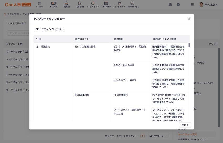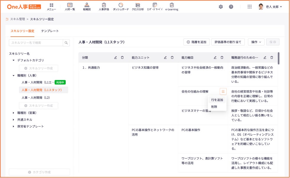 また、厚生労働省が公開している職業能力評価基準に基づいた業種横断的な事務系職種のスキルテンプレート(19職種、96種類)をベースに、スキル評価項目をカスタマイズすることも可能です。