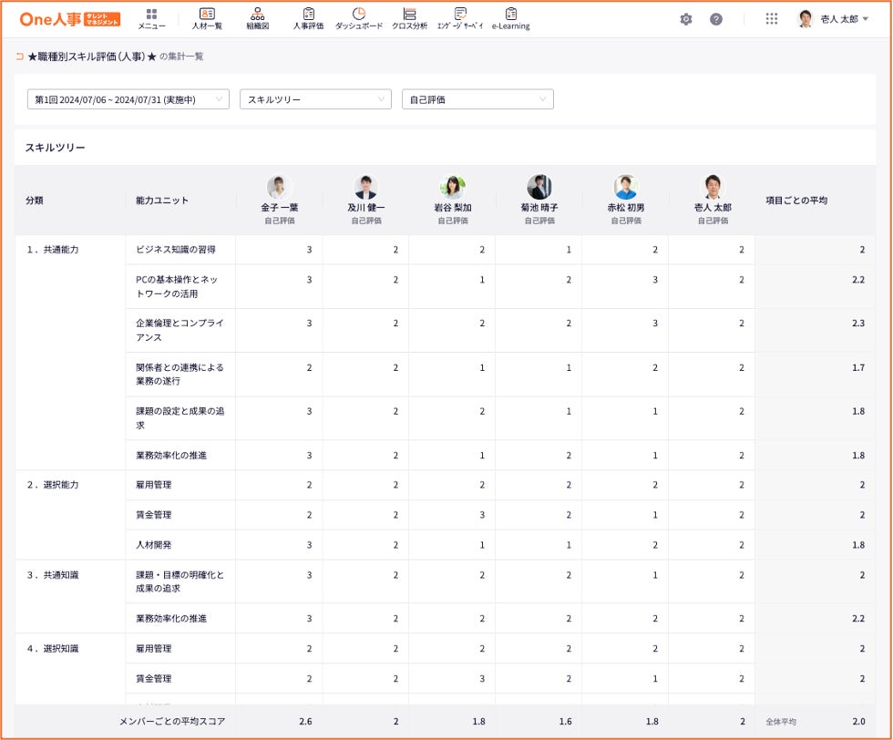 集計画面では、メンバーごとのスキル評価スコア、またスキル項目ごとの評価スコアを集計し、どの社員のスキルが高いのか、組織的にどのスキルが弱いのかといった現状を把握できるため、強化すべきスキルに対してピンポイントで効果の高い育成施策の実施が可能です。さらに一人一人のスキル特性に応じた配置や育成が実現でき、現有人材資産の最大活用および今後の組織的な戦力アップに繋げることが期待されます。