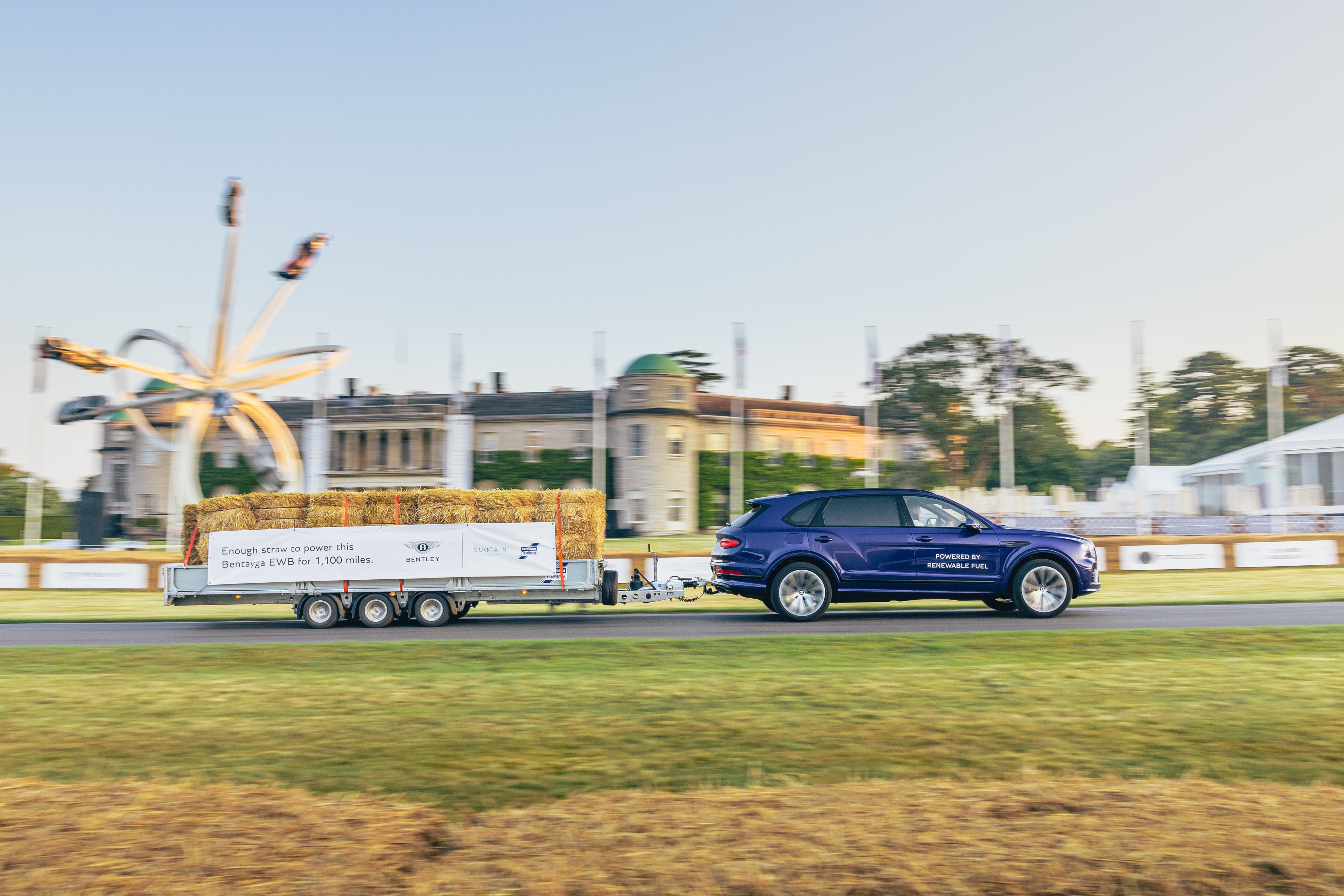 ベントレーはこのバイオ燃料を使ってグッドウッドで6台の屈強なマシンを走らせ、32のヒルクライムをすべて成功させました。第2世代バイオ燃料を使用した750PS、W12エンジン搭載のバトゥールは、ヒルクライムで55.0秒を記録し、市販車トップ3に入りました。ベントレーの最新フラッグシップ、ベンテイガEWBもわずか1分21秒でヒルクライムを完走しました。それだけでも印象的ですが、さらに驚くことにその記録は2.5トンもの藁を牽引しての記録となります。この2.5トンの藁をバイオ燃料に変換すれば、ベンテイガを1100マイル走らせることができ、グッドウッドで週末を過ごしたすべてのベントレーに燃料を供給することができる量となります。