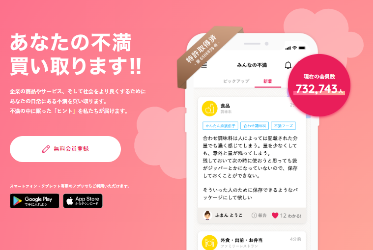 不満買取センター(特許取得済み)は、「企業の商品やサービス、そして社会をより良くするために、あなたの不満を買い取ります。あなたの不満の中に眠った”ヒント”を私たちが企業や社会に届けます」をコンセプトに、2015年3月18日からサービス開始をしております。Webサービス及びスマートフォンアプリを通して生活者からの不満の声を収集しており、現在累計73万人以上の会員から、累計4,000万件以上の不満を買い取っています。