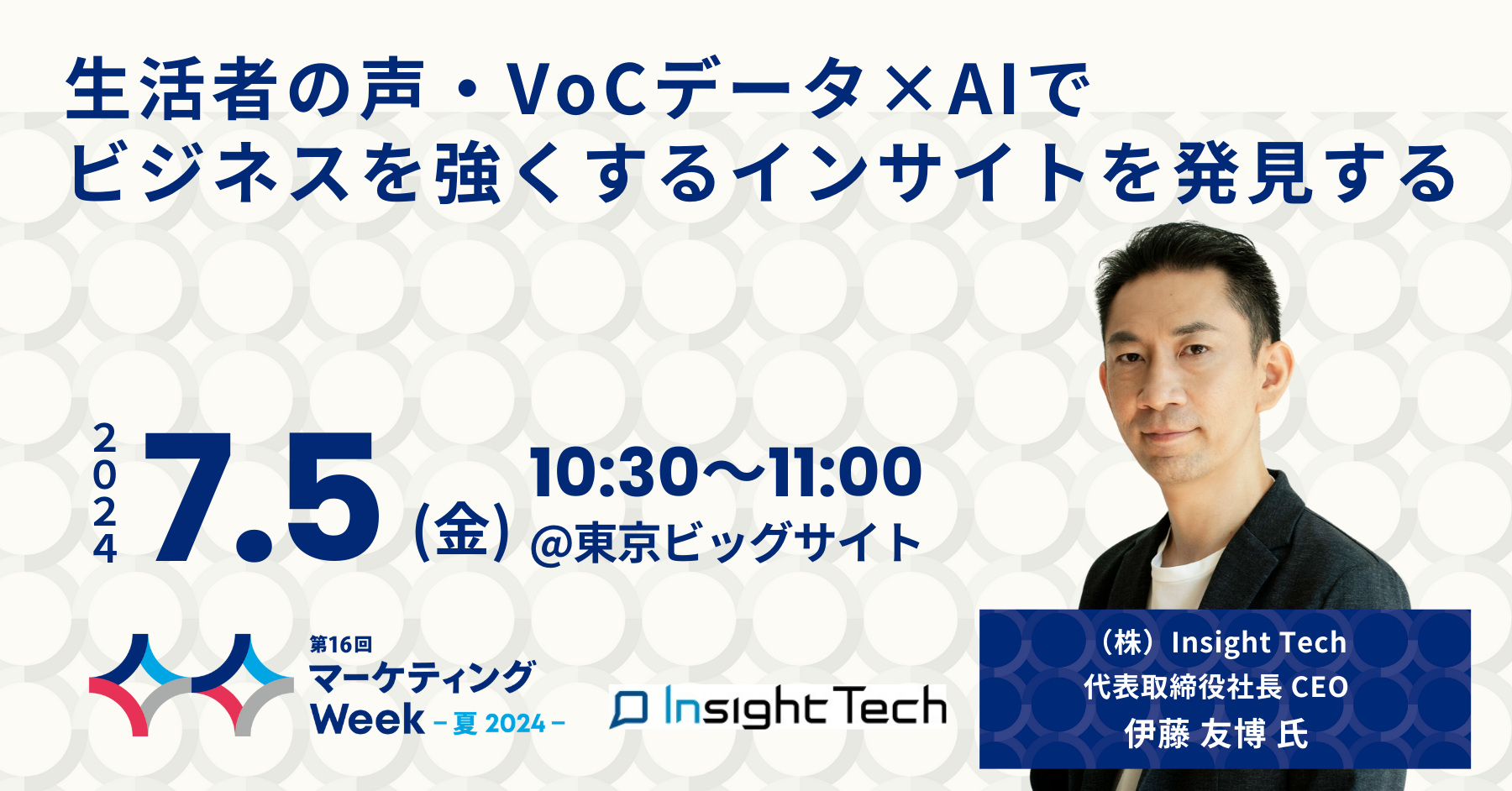 Insight Techは、日本最大級のマーケティングの総合展示会「第16回 マーケティングWeek ‐夏 2024‐」において、「生活者の声・VoCデータ×AIでビジネスを強くするインサイトを発見する」をテーマとしたセミナーに登壇いたします。