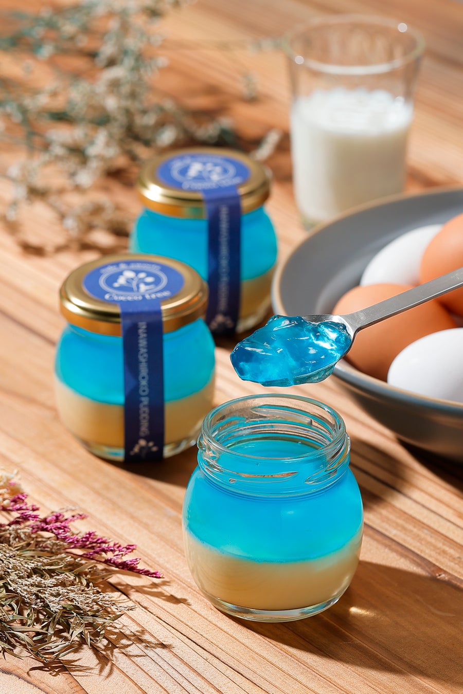 県内産の材料にこだわった当店自慢のとろ~りなめらかぷりんの上に、会津・猪苗代湖をイメージした色鮮やかな青色のジュレをいれたジュレぷりんです。ジュレの中には、キラキラした湖面をイメージした星形のナタデココは入っており、お召し上がりいただいたお客様に幸せをお届けしたいという思いが込められています。