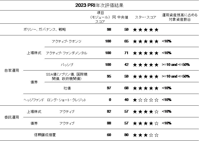 PRI年次評価では、PRI事務局が、各署名機関が提出するレポートを基に、責任投資の実施状況等を対象項目ごとに5段階で評価します。10項目中、8項目で大きく中央値を上回り、全体の方針である「ポリシー、ガバナンス、戦略」のほか、自家運用の上場株式3項目と債券2項目で「5つ星」を獲得しました。