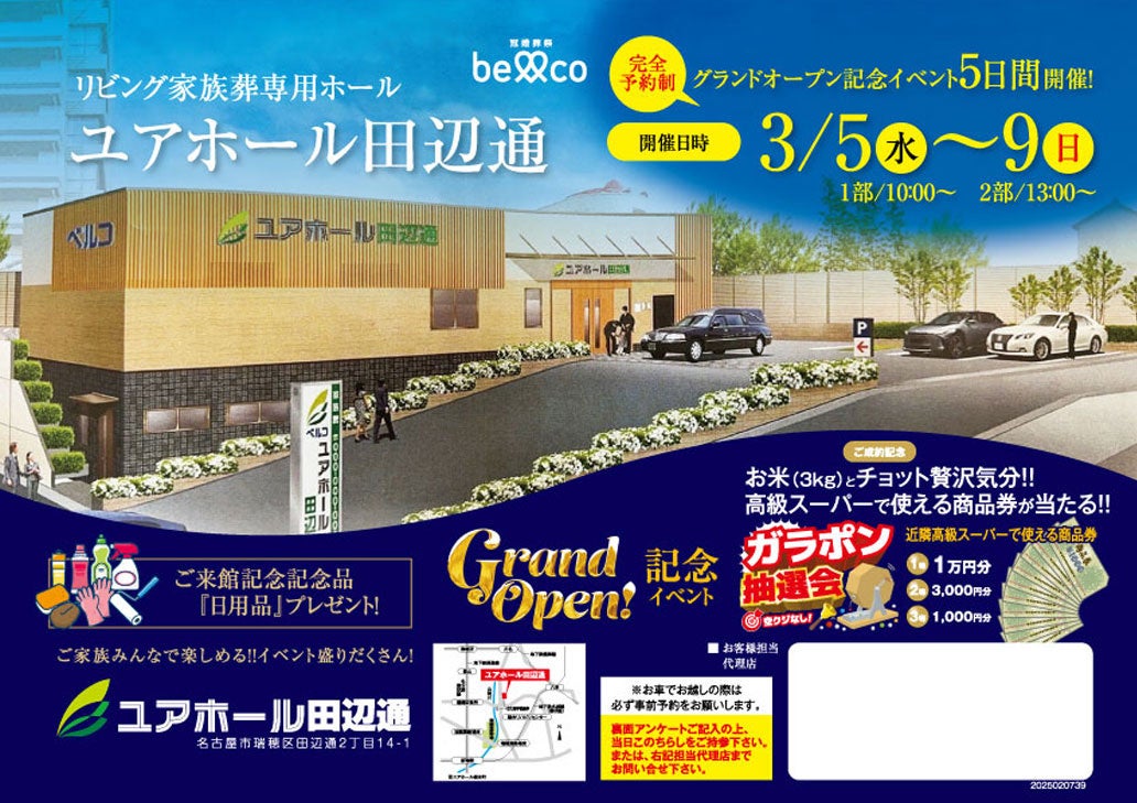 株式会社ベルコは、名古屋市瑞穂区に1日1組限定の家族葬専用ホール「ユアホール田辺通」を2024年3月にオープンいたします。これに伴い、3月5日(水)~9日(日)の5日間、完全予約制のグランドオープン記念イベントを開催いたします。
